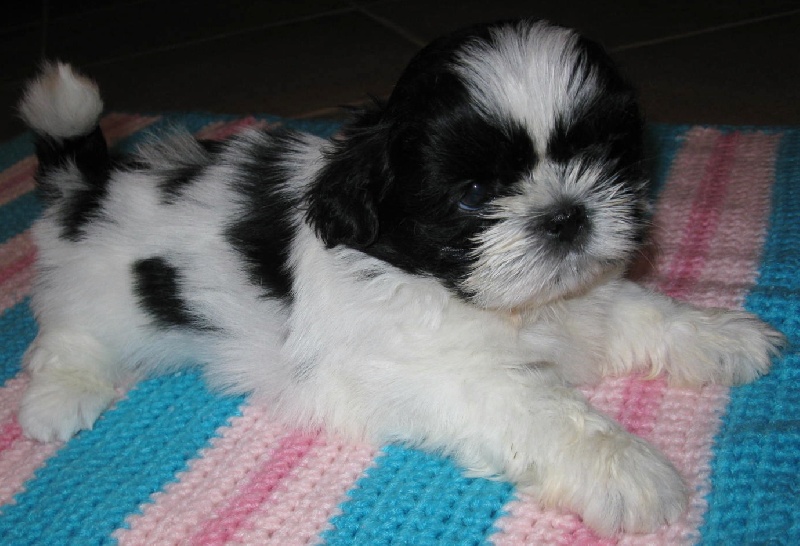 Hibou est le nom d'un shih tzu mythique,lui aussi noir et blanc,peut-être pas facile à porter mais ce chiot ne manque pas de carrure.